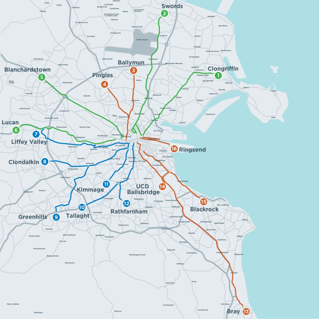 The proposed Bus Connects bus routes and the trees within 20m zone centred of the road centrelines. The table shows the length of route, the number of trees within the 20m and 10m zones, the estimated amount of Carbon stored and the equivalent number of cars. The car estimate is based on the emissions of a typical car completing each bus route into and out of the city 365 days a year.