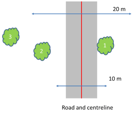 i) The number of trees along each corridor was estimated by placing the proposed bus routes over a satellite image. All the trees within a 20m and 10m zone around the road centreline were mapped; that is all trees within 10/5m of the road centreline on either side. These 20/10m widths were selected as representing the likely range of road widening based on a typical carriage lane width of 3.5 m (that is, 7 m from pavement to pavement). In the example, tree canopy 1 is inside the 10 and 20m zones, 2 is outside 10m and within 20m and, 3 is outside both zones.